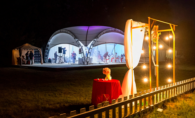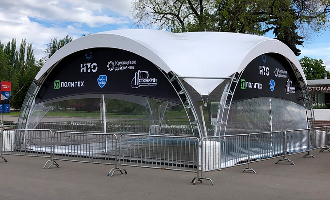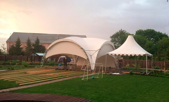 Арочная каркасно-тентовая конструкция типа «Дюна» на основе стального каркаса с защитой металла методом горячего цинкования. Арочные шатры часто применяются для проведения массовых и развлекательных мероприятий, фуршетов, банкетов, организации посадочных мест в точках общественного питания и для других целей. Преимуществами конструкции является лёгкий вес, быстрая сборка, длительный срок службы, сборно-разборная конструкция. Шатры типа «Дюна» можно часто увидеть в составе временной инфраструктуры при комплексной застройке каркасно-тентовыми конструкциями площадки для проведения масштабных мероприятий.