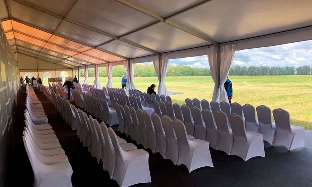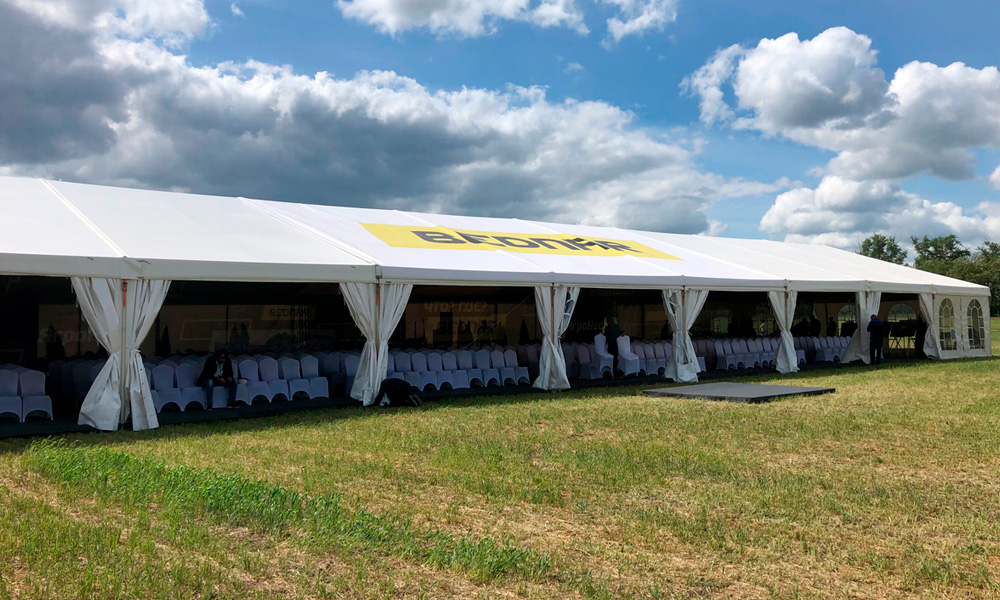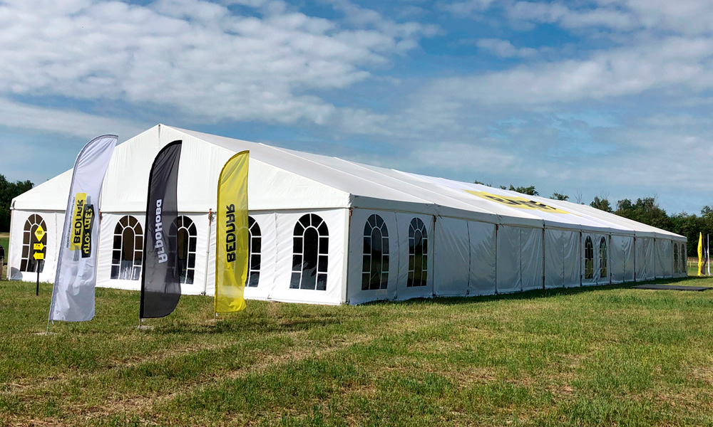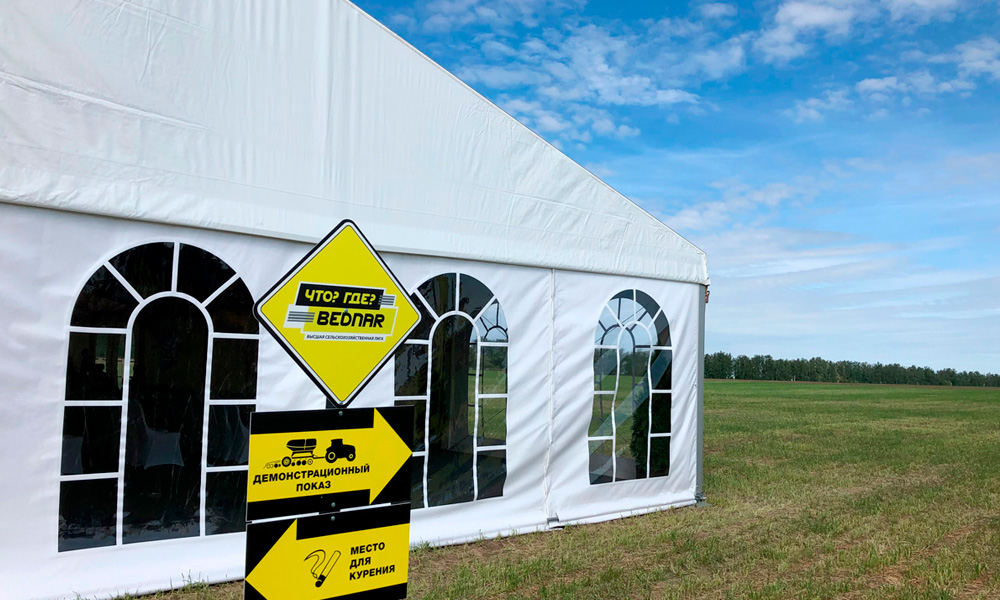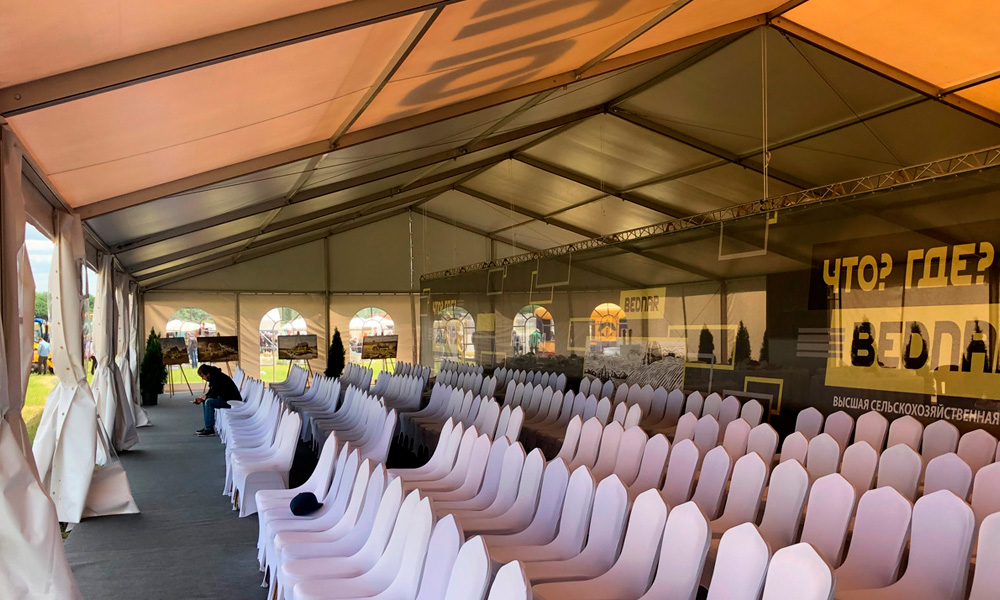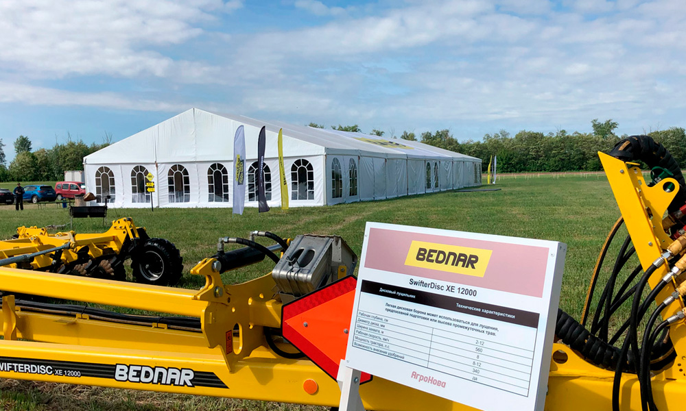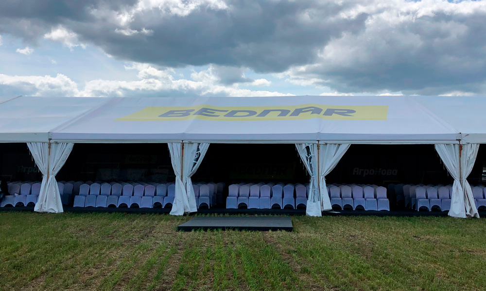 "Bednar"kompaniyasining qishloq xo'jaligi texnikasini namoyish etish uchun maydonga standart ikki qavatli chodir-PVX konstruktsiyasi o'rnatilgan. Ayvon pavilyoni quyoshli ob-havo sharoitida mehmonlar uchun qulay haroratni ta'minlaydigan yorug'lik o'tkazmaydigan ayvon (qorayish) bilan jihozlangan. Chodirning chodir tuvalini UV bosib chiqarish usuli bilan markalash amalga oshirildi. Qurilishning umumiy qoplama maydoni 575 m2, devor balandligi 3 metr. Strukturaning uzunligi 45 metr, qo'llab-quvvatlanmaydigan kengligi 15 metr. Chodir yumshoq derazalar, yog'och, kontrplak va gilamga asoslangan soyabonlar va pollar bilan jihozlangan.
