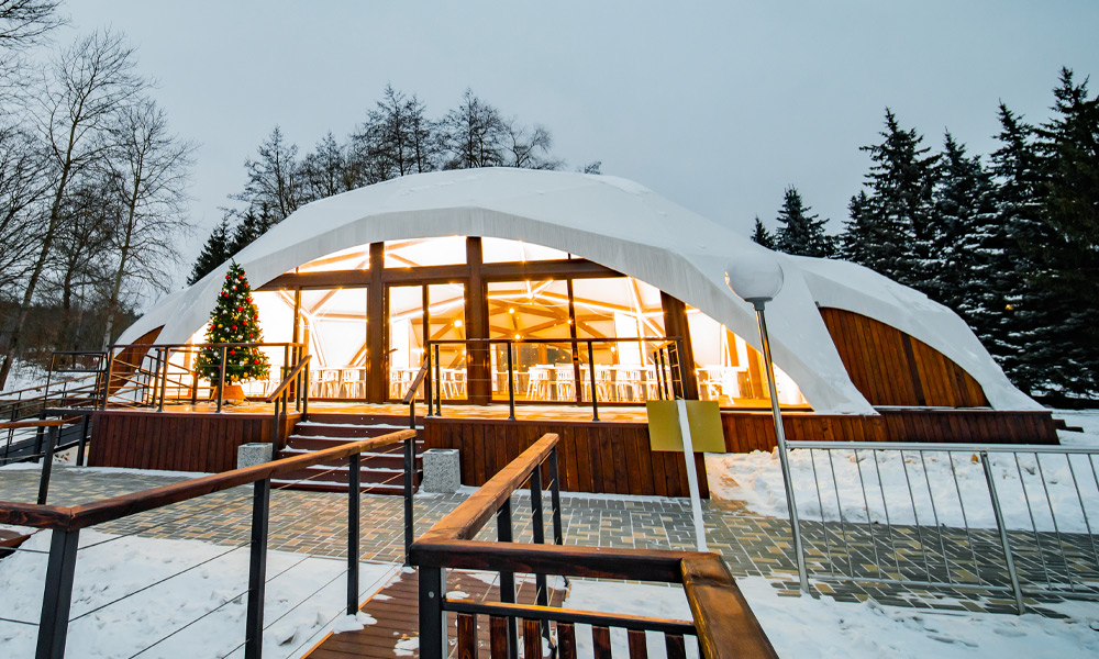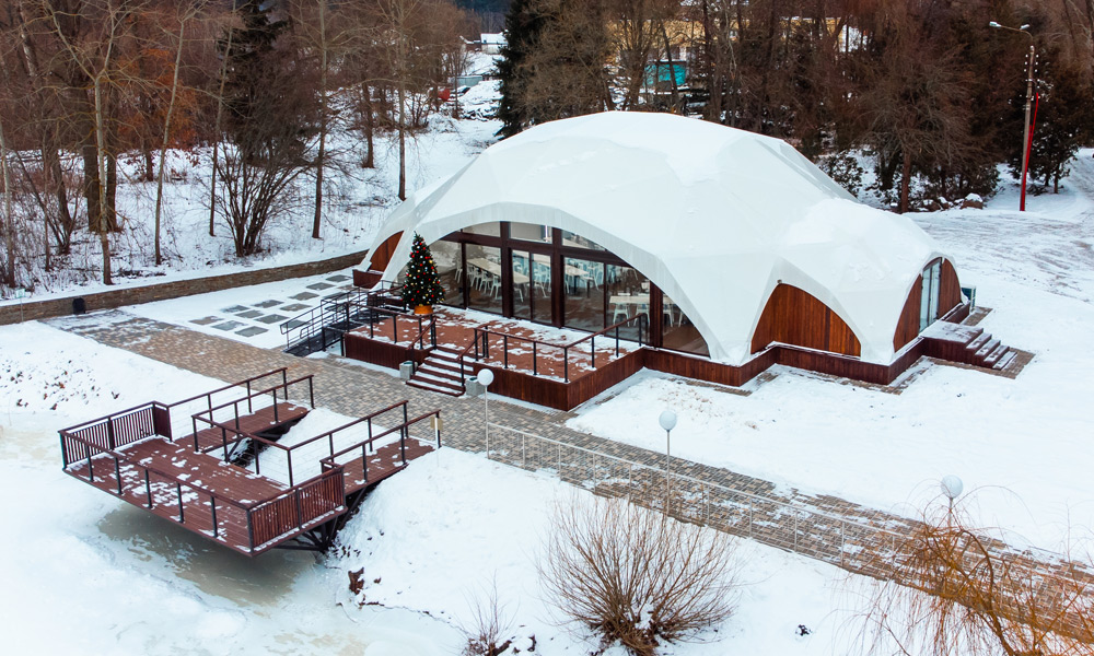 Kompaniyamiz tomonidan ishlab chiqilgan, ishlab chiqarilgan va restoran uchun yog'och ramkaga o'rnatilgan chodir. Chodir tuzilishining yuqori darajadagi ko'rinishi, yaratilgan xonaning funktsional imkoniyatlari bilan birgalikda, yilning istalgan vaqtida ziyofatlar, to'ylar, bayramlar va boshqa tadbirlarni o'tkazish uchun ideal echim bo'lib, raqobatchilardan ajralib turishga imkon beradi.