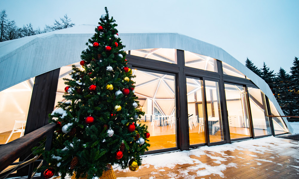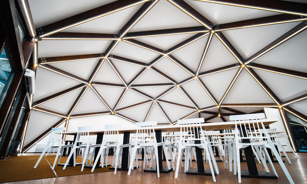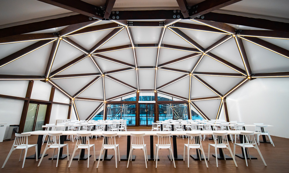 Yog'och yopishtirilgan nurlardagi chodir ramkasi. Tent materiallari "Mehler Technologies", G1 yonuvchanlik guruhi, zichligi 800 g/m2, Germaniya ishlab chiqarishi. Ramka daraxti fin tilidagi "Osmo" bo'yoq bilan qoplangan. Kvadrokupol 210 kg/m2 to'liq qor yukiga bardosh bera oladi. Hajmi 15x17 metr. Umumiy foydalanish maydoni 295 m2. Asl ichki yoritish amalga oshirildi.