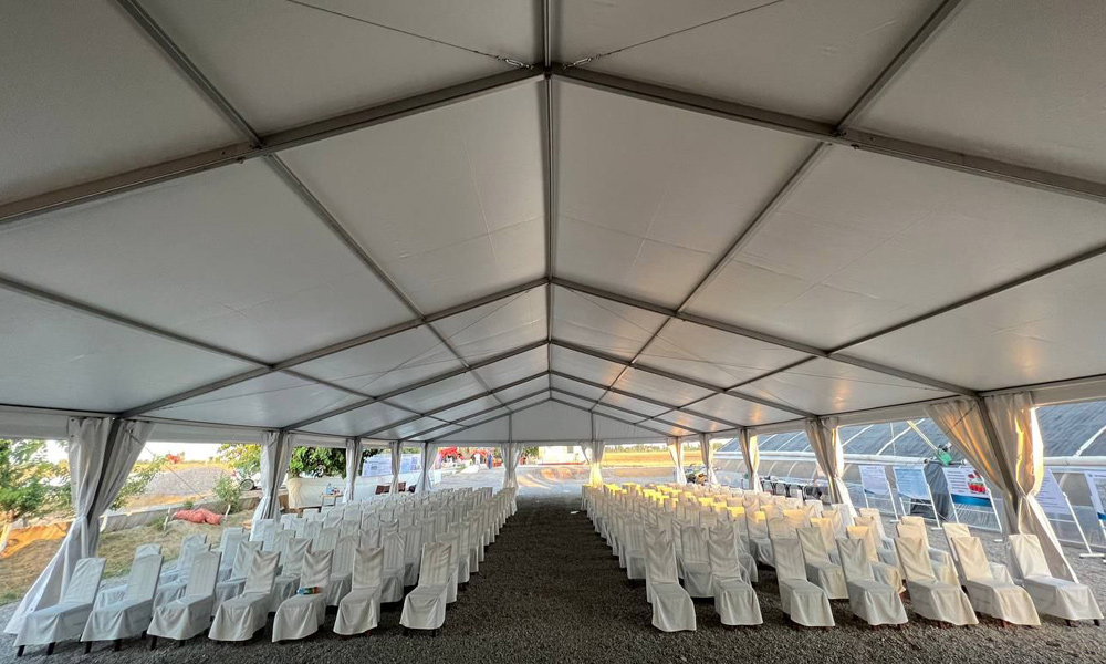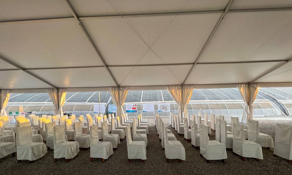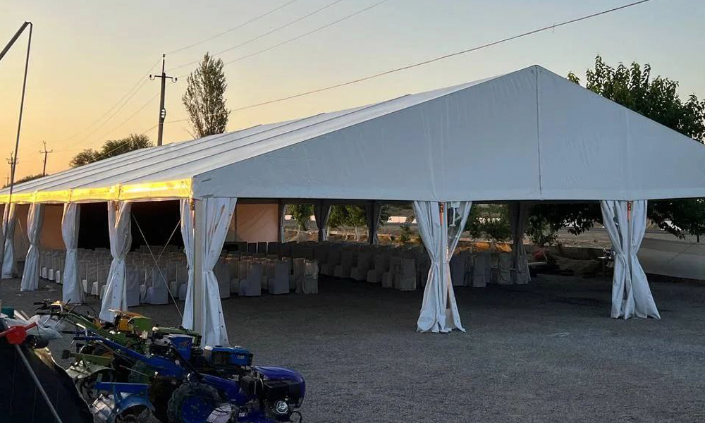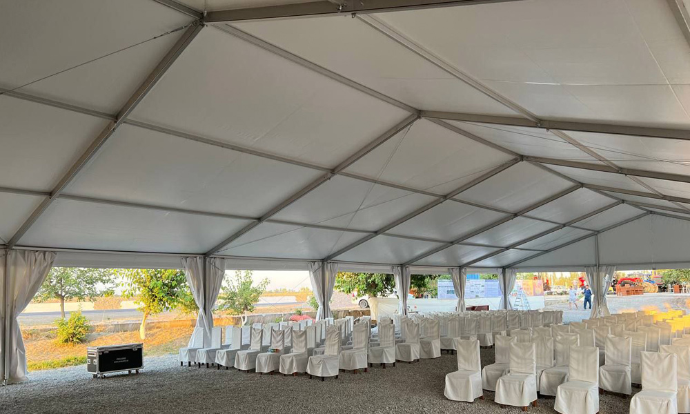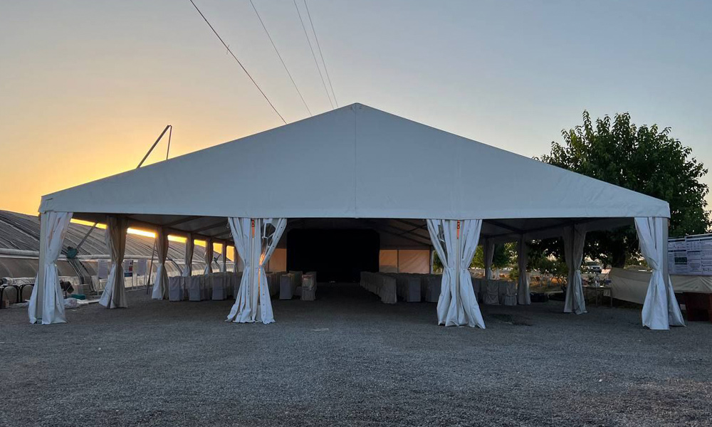 Tinglovchilarni ochiq havoda joylashtirish uchun 15x30 metr o'lchamdagi Gable chodiri juda mos edi, u 450 m2 yopiq maydonga ega 300 tagacha mehmonni sig'dira oladi. Alyuminiydan tayyorlangan tez yig'iladigan ramka bir kun ichida strukturani qurishga imkon beradi. Yuqori sifatli yuqori zichlikdagi PVX mustahkamlangan chodir bilan birgalikda chodir sekundiga 20 metrgacha bo'lgan shamol yuklariga bardosh beradi va mehmonlarni elementlardan ishonchli himoya qiladi.